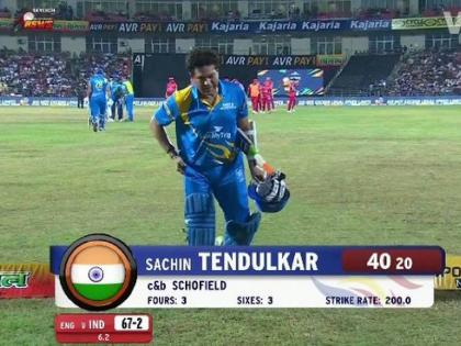 इंडिया लीजंड्स ( India Legends) संघाचे कर्णधारपद भूषविणाऱ्या सचिनने आज वादळी खेळी केली. इंग्लंड लीजंड्स ( England Legends) संघाच्या गोलंदाजाची धुलाई केली. सचिनने २००च्या स्ट्राईक रेटने खणखणीत फटकेबाजी केली. नमन ओझासह सलामीला आलेल्या सचिनने पहिल्या विकेटसाठी ५.४ षटकांत ६५ धावा जोडल्या. नमन २० धावा करून बाद झाला. सचिनने २० चेंडूंत ४० धावा केल्या. पण, त्याने ३ चौकार व ३ षटकार खेचून अवघ्या ६ चेंडूंत ३० धावा कुटल्या. सुरेश रैना १२ व युसूफ पठाण २७ धावांवर माघारी परतल्याने भारतीय संघाची अवस्था ४ बाद १०८ अशी झाली होती.