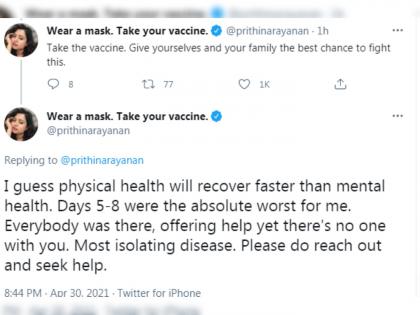 ''कोरोना लस घ्या. तुम्हीही घ्या आणि कुटुंबीयांना घेऊ द्या... कोरोनाविरुद्धची लढाई जिंकण्याचा हा सर्वोत्तम मार्ग आहे. या आजारानंतर येणारी शारिरीक अशक्तपणा आपण भरून काढू, परंतु मानसिक आरोग्यासाठी वेळ लागेल. ५ ते ८ वा दिवस हा माझ्यासाठी अत्यंत खराब होता. सर्व जण तिथं होती, मदत करत होती, तरीही सोबत कुणीच नव्हतं. आयसोलेशनमध्ये होती,''असंही तिनं लिहिलं.