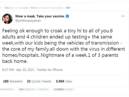 प्रिथीनं ट्विट केलं की,''तुम्हाला हाय बोलण्याइतकं मला बरं वाटत आहे. या एकाच आठवड्यात कुटुंबातील ६ प्रौढ व ४ मुलांना कोरोनाची लागण झाली आहे. आमची मुलं या संसर्गाचे वाहक ठरले. सगळे वेगवेगळ्या घरी व हॉस्पिटलमध्ये उपचार घेत आहोत. हा आठवडा काळरात्रीसारखा आहे. ३ पालकांपैकी १ पालक घरी आहे.''