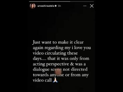 सोशल मीडियावर उर्वशीच्या प्रेमप्रकरणाची अफवा पसरताच तिने इस्टाग्रामवर स्टोरी टाकून याला पूर्णविराम दिला आहे. तिच्या इंस्टाग्राम स्टोरीवर उर्वशीने स्पष्ट केले की, "मला माझ्या आय लव्ह यू व्हिडीओबद्दल पुन्हा स्पष्ट करायचे आहे. जे सध्या सगळीकडे व्हायरल होत आहे, तो व्हिडीओ केवळ अभिनयाच्या दृष्टिकोनातून आणि एखाद्याने दिग्दर्शित केलेला संवाद सीन होता." खरं तर उर्वशीने काही दिवसांपूर्वी एक रोमॅंटिक व्हिडीओ पोस्ट केला होता. त्याच्या कॅप्शनमध्ये लिहले होते की, "समझो..." या व्हिडीओवरून अनेक तर्कवितर्क लावले जात आहेत.