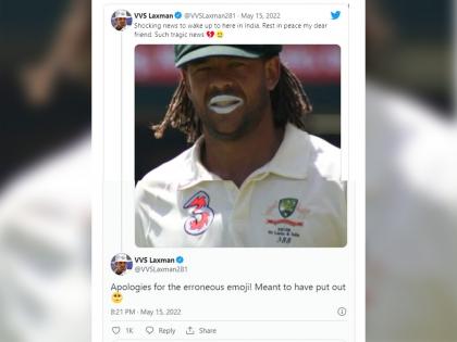 ऑस्ट्रेलियासाठी दमदार कारकीर्द घडवणारा अँड्र्यू सायमंड्स IPL मध्येदेखील डेक्कन चार्जर्स आणि मुंबई इंडियन्स संघाकडून खेळला होता. त्यामुळेच त्याचे भारतातही असंख्य चाहते आहेत. या चाहत्यांसाठी रविवारची सकाळ धक्कादायक ठरली. सायमंड्सच्या अपघाती मृत्यूमुळे क्रिकेटविश्वावर शोककळा पसरली. व्हीव्हीएस लक्ष्मणने त्याला श्रद्धांजलीपर ट्वीट करताना लिहिले, "भारतात आजची सकाळ एका धक्कादायक बातमीने झाली. माझ्या प्रिय मित्रा, देव तुझ्या आत्म्यास शांती देवो. खरंच ही घटना वाईट आहे." लक्ष्मणने आपल्या भावना व्यक्त केल्या, पण इमोजी टाकण्याच्या नादात मोठी चूक केली. त्याने दोन इमोजी ट्वीट केल्या, यातली पहिली इमोजी तुटलेल्या हृदयाची होती, तर दुसरी रडण्याची. यातली दुसरी इमोजी रडण्याची असली तरी ती आनंदाश्रूंची होती. यावरून चाहत्यांनी लक्ष्मणला इमोजी बदलण्याचा सल्ला दिला. त्यानंतर त्यानेही चूक मान्य करत माफी मागितली आणि इमोजीबाबत स्पष्टीकरण दिले.![]()