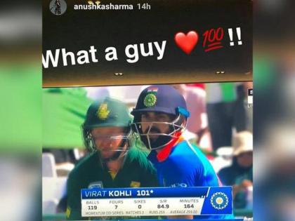 याच सामन्यात विराट कोहलीनं नाबाद 160 धावा ठोकल्यानंतर पत्नी अनुष्कानंही त्याच्यावर कौतुकाचा वर्षाव सुरू केला. सोशल मीडियावर एका मागून एक धडाधड पोस्ट करत अनुष्कानं विराटच्या खेळीची प्रचंड प्रशंसा केली आहे. तिनं इन्स्टाग्रामवर पती कोहलीचे फोटो शेअर करत त्याला चीअर केले. 'What A Guy', असं कॅप्शन देत तिनं इन्स्टा स्टोरीमध्ये कोहलीचे फोटो शेअर केले आहेत. विराटचे हे फोटो यानंतर प्रचंड प्रमाणात व्हायरल होत आहेत. पती विराट कोहलीला अशा पद्धतीनं चीअर करण्याचा अनुष्का शर्माचा अंदाज त्यांच्या चाहत्यांना प्रचंडच भावल्याचं यावरुन दिसत आहे. केवळ अनुष्काच नाही तर विराट कोहलीनं देखील जाहिररित्या आपल्या प्रेमाचं दर्शन लोकांना घडवलं आहे. सेंचुरियन टेस्ट मॅचदरम्यान विराटनं 150 धावा ठोकल्यानंतर त्यानं हेलमेट काढून आपल्या वेडिंग रिंगला किस केले होते.