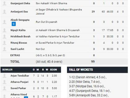 आसामने नाणेफेक जिंकून प्रथम फलंदाजीचा निर्णय घेतला. अर्जुनने दानिश अहमद, ऋषिकेश बोरा आणि ऋतुराज विश्वास यांना बाद केले. आसामचा संपूर्ण संघ 99 धावांवर माघारी परतला. अर्जुनला दिव्यांशने दोन विकेट घेत उत्तम साथ दिली.