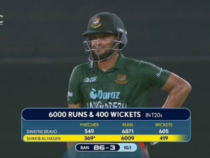 ट्वेंटी-२० क्रिकेटमध्ये ६०००+ धावा आणि ४००+ विकेट्स घेणारा शाकिब दुसरा खेळाडू ठरला. त्याने ट्वेंटी-२० क्रिकेटमध्ये ३६९ सामन्यांत ६००९ धावा व ४१९ विकेट्स घेतल्या आहेत. विंडीजचा ड्वेन ब्राव्हो ५४९ सामन्यांत ६८७१ धावा व ६०५ विकेट्ससह या विक्रमात अव्वल स्थानी आहे.