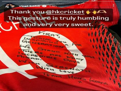 विराट कोहलीला हॉंगकॉंगच्या संघाने त्यांच्या जर्सीवर एक मेसेज लिहून खास भेट दिली आहे. "एका पिढीला प्रेरणा दिल्याबद्दल धन्यवाद. आम्ही तुझ्या नेहमी पाठीशी उभे आहोत. पुढे अनेक अविश्वसनीय दिवस असतील. पूर्ण ताकदीने आणि प्रेमाने हॉंगकॉंगचा संघ तुझ्यासोबत आहे", अशा शब्दांत हॉंगकॉंगच्या संघाने किंग कोहलीचे अभिनंदन केले आहे. हॉंगकॉंगने दिलेल्या खास भेटीचा स्क्रीनशॉट विराट कोहलीने त्याच्या अधिकृत इंस्टाग्राम प्रोफाइलवर पोस्ट केला आणि लिहिले, "धन्यवाद @hkcricket. हे खरोखरच नम्र आणि खूप गोड आहे."