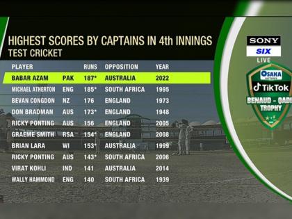 - चौथ्या डावात सर्वाधिक चेंडूंचा सामना करणाऱ्या जगातील फलंदाजांमध्ये बाबरने चौथे स्थान पटकावले. या विक्रमात इंग्लंडचे माईक अथेर्टन ( ४९२) व हर्ब सटक्लिफ ( ४६२) हे अव्वल दोन क्रमांकावर आहेत, तर भारताने सुनील गावस्कर ४४३ चेंडूंचा सामना करून तिसऱ्या क्रमांकावर आहेत.