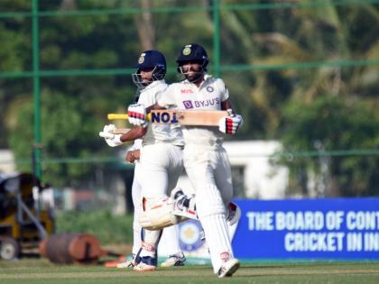 प्रत्युत्तारात यशस्वी व अभिमन्यू यांनी पहिल्या विकेटसाठी २८३ धावांची भागीदारी केली. यशस्वीने २२६ चेंडूंत २० चौकार व १ षटकारासह १४५ धावा केल्या. अभिमन्यूने २५५ चेंडूंत ११ चौकार व १ षटकार १४२ धावांची खेळी केली. यश धुल २० धावांवर बाद झाल्याने भारताला ३२५ धावांवर तिसरा धक्का बसला.