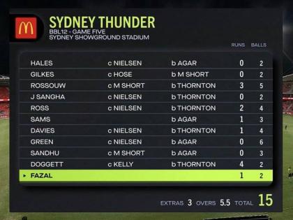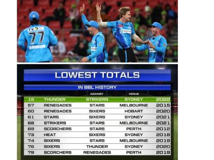 बिग बॅश लीगमध्ये शुक्रवारी ऐतिहासिक विक्रमाची नोंद झाली. सिडनी थंडर्स आणि एडिलेड स्ट्रायकर्स यांच्यातला सामना ट्वेंटी-२० क्रिकेटच्या विक्रमात एका वेगळ्या विक्रमाने नोंदवला गेला. पीटर सिडलच्या नेतृत्वाखाली खेळणाऱ्या एडिलेड स्ट्रायकर संघाने ९ बाद १३९ धावा केल्या आणि प्रत्युत्तरात सिडनी थंडर्सचा संपूर्ण संघ १५ धावांत तंबूत परतला. ट्वेंटी-२० क्रिकेटमधील ही सर्वांत निंचाक धावसंख्या ठरली. २०१९मध्ये टर्कीचा संघ झेक प्रजासत्ताकविरुद्ध २१ धावांवर तंबूत परतला होता.