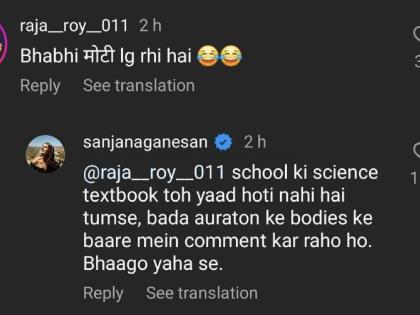 जसप्रीत बुमराहने सोमवारी त्याच्या इंस्टाग्राम पेजवर एक प्रमोशनल व्हिडिओ पोस्ट केला, जो एका ब्रँडची जाहिरात आहे आणि त्यात त्याची पत्नी संजना देखील यामध्ये आहे. त्यावर ट्रोलर्सनी तिच्यावर कमेंट केली. संजना आणि जसप्रीत नुकतेच आई-बाबा झाले आहेत. जसप्रीतच्या व्हिडिओवर एकाने कमेंट केली की ''भाभी मोटी लग रही है''... अशा अनेक कमेंट होता. त्यावर संजनाने सडेतोड उत्तर दिले. तिने लिहिले की, तुम्ही तुमच्या शाळेतील विज्ञानाच्या पुस्तकांतूनही काही शिकू शकत नाही आणि इथे तुम्ही स्त्रियांच्या शरीराबद्दलचे ज्ञान दाखवण्यासाठी आला आहात. पळ इथून... ( स्कूल की विज्ञान पाठ्यपुस्तक तो याद होती नहीं है तुमसे, औरतों के शरीर के बारे में खराब टिप्पणी कर रहे हो. भागो यहा से).