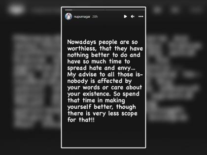 भुवनेश्वरची पत्नी नुपूर हिने आपल्या इस्टाग्रामवर स्टोरीवरून टीकाकारांना चांगलंच सुनावले. आजकाल लोकं खूपच रिकामटेकडे झालेत. लोकांकडे काहीच काम नसतं. त्यामुळे अशी रिकामटेकडी लोकं केवळ समाजात द्वेष पसरवण्याचं काम करतात आणि भावना दुखावण्याचा प्रयत्न करतात. अशा लोकांना माझा एक सल्ला आहे की तुमच्या असल्या टीकांना किंवा शब्दांना आम्ही घाबरत नाही. तुमच्या शिव्या-शापांनी आमचं काहीही बिघडणार नाही. त्यामुळे अशा टीकाटिप्पणी करण्यापेक्षा स्वत:ला अधिक चांगल्या पद्धतीने विकसित करण्याचा प्रयत्न करत राहा आणि त्यासाठी तुमची ऊर्जा खर्च करा, कारण तुमच्या वाईट शब्दांतील टीकेचा कोणावरही काहीही फरक पडणार नाही, अशा शब्दांत नुपूरने आपला राग व्यक्त केला.