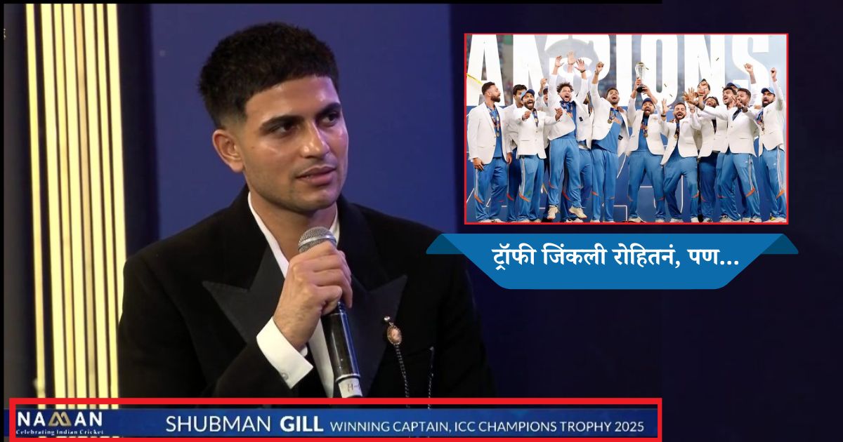 बीसीसीआयने बदलाची गरज नसताना वनडेत रोहित शर्माच्या जागी शुभमन गिलला नवा कॅप्टन केले. ICC चॅम्पियन्स ट्रॉफी जिंकून देऊन रोहित शर्माबाबत जे घडलं ते चुकीच आहे, अशी चर्चाही रंगली आता त्यात बीसीसीआयने वार्षिक पुरस्कार सोहळ्यात मोठी चूक केली आहे. ICC चॅम्पियन्स ट्रॉफी जिंकण्याच श्रेय चक्क शुभमन गिलला देण्यात आले. ही गोष्ट रोहित शर्माच्या चाहत्यांना चांगलीच खटकली असून या मुद्यावरुन चाहते बीसीसीआयवर चांगलेच संतापले आहेत. सोशल मीडियावर तशा प्रतिक्रिया उमटत आहेत.. BCCI च्या चुकीमुळे काहीजण तर शुभमन गिललाही ट्रोल करत आहेत. BCCI च्या पुरस्कार सोहळ्यात असं नेमकं काय घडलं? जाणून घेऊयात सविस्तर