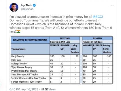 भारतीय क्रिकेटला मोठे करण्यासाठी बीसीसीआय कोणतीही कसर सोडत नाही आणि त्यात सातत्याने सुधारणा करत आहे. महिला प्रीमियर लीगची सुरुवात केली आणि इंडियन प्रीमियर लीगमध्ये मोठे बदल केले. बीसीसीआयचे सचिव जय शाह ( Jay Shah) यांनी आज मोठी घोषणा केली. BCCI ने देशांतर्गत स्पर्धांवरही पैशांचा वर्षाव केला आहे. देशांतर्गत क्रिकेटला प्रोत्साहन देण्यासाठी बीसीसीआयने बक्षीस रकमेत वाढ केली आहे. देशांतर्गत रणजी करंडक, इराणी, दुलीप करंडक, विजय हजारे करंडक, देवधर करंडक, सय्यद मुश्ताक अली करंडक, वरिष्ठ महिला वन डे करंडक, वरिष्ठ महिला ट्वेंटी-२० करंडक या स्पर्धांचा समावेश आहे.