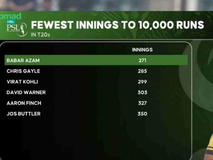 कराची किंगविरुद्धच्या आजच्या लढतीपूर्वी बाबरने २७० इनिंग्जमध्ये ९९९४ धावा केल्या होत्या आणि त्याच्या नावावर १० शतकं व ८३ अर्धशतकं नोंदवली गेली आहेत. आज त्याने सहावी धाव घेऊन ट्वेंटी-२०त १० हजार धावा पूर्ण केल्या.