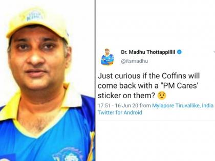 भारत आणि चीन सैनिकांमध्ये १५ आणि १६ जून रोज गलवान खोऱ्यात संघर्ष झाला. या परिसरात तैनात असलेले जवान जखमी झाले आहेत. त्यातील २० जणांन शहीद झाले. भारतीय सूत्रांनुसार चीनच्या ४३ सैनिकांपैकी काहींचा मृत्यू तर काही गंभीररित्या जखमी झाल्याची माहिती आहे. मधू यांनी ट्विट केलं की,''शहीद जवानांची शव पेटी PM CARES चे स्टीकर्स लावून येतायत का?''