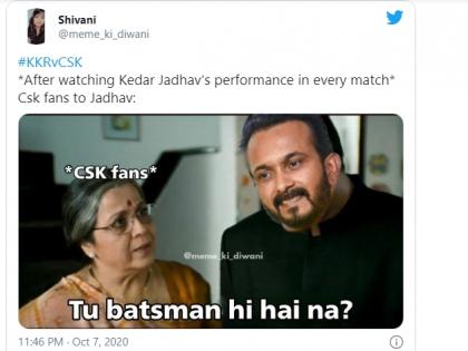 विजयासाठी २१ चेंडूंत ३८ धावांची गरज असताना केदार जाधव खेळपट्टीवर आला. पण, त्याला फटके मारताच आले नाही. त्यामुळे, नेटीझन्सच्यामते चेन्नईच्या पराभवाचा व्हिलन केदार जाधव ठरला. म्हणून चेन्नईच्या चाहत्यांनी पराभवानंतर केदार जाधवला ट्रोल करण्यास सुरूवात केली.