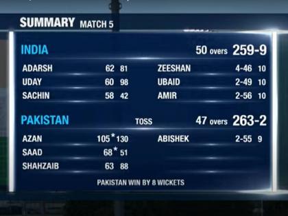 पण, भारताच्या गोलंदाजांच्या वाट्याला आज यश नव्हते. मुरुगन अभिषेकने पाचव्या षटकात पाकिस्तानचा सलामीवीर श्यामी हुसैनला ( ८) बाद केले. पण, साहजैब खान व अझान अवैस यांनी ११० धावांची केलेली भागीदारी महत्त्वाची ठरली. ६३ धावा करणाऱ्या खानला अभिषेकने माघारी पाठवले. कर्णधार साद बैगने अझानसह पाकिस्तानला विजय मिळवून दिला. अझान १३० चेंडूंत १० चौकारांसह १०५ धावांवर नाबाद राहिला, तर बैगनेही ५१ चेंडूंत नाबाद ६८ धावा केल्या. पाकिस्तानने ४७ षटकांत २ बाद २६३ धावा केल्या.