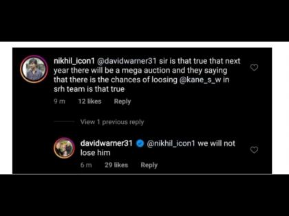 आयपीएल 2020च्या यशस्वी आयोजनानंतर BCCI आता पुढील वर्षाच्या आयपीएलच्या तयारीला लागले आहेत. डिसेंबरच्या दुसऱ्या आठवड्यात IPL 2021 Auctionबाबतचा निर्णय घेतला जाईल. यंदाच्या लीगमधील कामगिरीनंतर प्रत्येक संघ पुढील वर्षी होणाऱ्या आयपीएलसाठी नव्यानं संघबांधणी करण्यासाठी सज्ज आहेत. आयपीएल 2021 लिलावाला काही संघांचा विरोध आहे, परंतु चेन्नई सुपर किंग्स, किंग्स इलेव्हन पंजाब संघांसाठी लिलाव फायद्याचा ठरेल. त्यात SRH केनला रिलीज करणार का, असा सवाल एका फॅन्सनं डेव्हिड वॉर्नरला विचारला. त्यावर वॉर्नरनं, केनला आम्ही गमावणार नाही, असे उत्तर दिले.