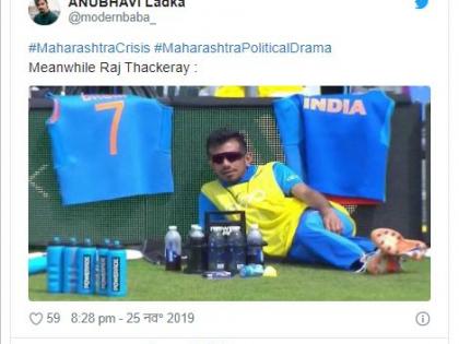 देवेंद्र फडणवीस यांचे सरकार पडल्यावर यु़जवेंद्रचा एक फोटो वायरल झाला आहे. हा फोटो लंडनमध्ये झालेल्या विश्वचषकातील आहे. या विश्वचषकातील एका सामन्यात युजवेंद्र संघाबाहेर होता आणि संघाला ड्रिंक्स देण्याचे काम तो करत होता. पाणक्याची भूमिका बजावता असताना युजवेंद्रचा एक रीलॅक्स फोटो आता वायरल झाला आहे आणि या फोटोमध्ये युजवेंद्रची तुलना राज ठाकरे यांच्याशी केली आहे.