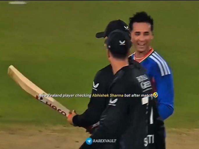 भारताच्या विजयानंतर सोशल मीडियावर एक व्हिडिओ तुफान व्हायरल होत आहे. यामध्ये न्यूझीलंडचा कर्णधार मिचेल सँटनर, डेव्हॉन कॉनवे आणि जेकब डफी हे अभिषेक शर्माची बॅट हातात घेऊन ती तपासाताना आणि हसताना दिसत आहेत. अभिषेकने अवघ्या २० चेंडूत नाबाद ६८ धावा कुटल्या. या खेळीत त्याने केवळ १४ चेंडूत अर्धशतक झळकावले, जे टी-२० आंतरराष्ट्रीय क्रिकेटमधील भारतीय फलंदाजाचे दुसरे सर्वात वेगवान अर्धशतक ठरले आहे.