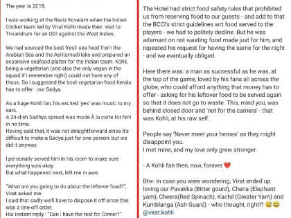 ''आम्ही वारंवार नकार देऊनही कोहलीने अन्न वाया जाऊ नये यासाठी आम्हाला विनंती केली. त्याचा विनंतीचा मान राखून आम्ही तेच जेवण त्याला रात्री दिले. आयुष्यात एवढा यशस्वी झालेला माणूस उरलेले पदार्थ पुन्हा द्यायला सांगतो. पैशाने जे मिळेल ते तो विकत घेऊ शकतो. पण, त्याला त्याचा गर्व नाही. अन्नाची नासाडी त्याला पटत नाही,” अशी पोस्ट पिल्लई यांनी लिहीली.