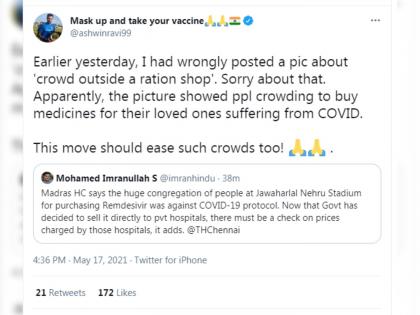 गेल्या चोवीस तासांत देशात २,८१,३८६ नव्या कोरोनाबाधितांची नोंद करण्यात आली. तर दुसरीकडे ३,७८,७४१ रुग्णांनी कोरोनावर मात केली आहे. आऱ अश्विन ( R Ashwin) च्या घरातील १० सदस्यांनाही कोरोनाची लागण झाली आहे. त्यामुळेच इंडियन प्रीमिअर लीगमधून ( IPL 2021) त्यानं माघार घेत घरच्यांसोबत राहण्याचा निर्णय घेतला. आर अश्विन त्यानंतर सोशल मीडियावरून सातत्यानं कोरोना संदर्भात जनजागृती करत आहे. पण, रविवारी त्यानं एक चूकीचं ट्विट केलं. त्यानं ट्विटमध्ये लोकांची गर्दी जमलेला फोटो पोस्ट करून नाराजी व्यक्त केली होती आणि सर्वांना सोशल डिस्टन्सिंगच्या नियमांचं पालन करा असं आवाहनही केलं होतं. पण, त्यानं सोमवारी एक ट्विट करून आपली चूक मान्य केली.