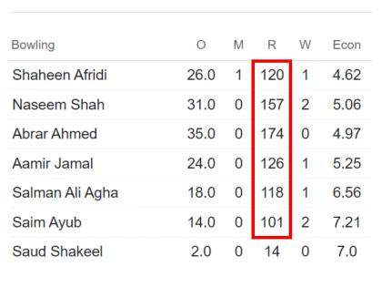 पाकिस्तानच्या गोलंदाजांचा चमू हा जगातील भेदक मारा करणारा चमू म्हणून ओळखला जातो. पण आज इंग्लंडच्या रूट-ब्रूक जोडीने यजमानांच्या गोलंदाजांना सळो की पळो करुन सोडले. नाणेफेक जिंकून प्रथम फलंदाजी करताना पाकिस्तानने ५५६ धावा केल्या होत्या. त्यानंतर इंग्लंडच्या फलंदाजांनी सपाट खेळपट्टीचा पुरेपूर फायदा घेत ८०० पार मजल मारली. पाकिस्तानच्या ६ गोलंदाजांनी शतकापेक्षाही जास्त धावा दिल्या. शाहीन शाह आफ्रिदीने २६ षटकात १२०, सइम अयूबने १४ षटकात १०१, सलमान अली आघाने १८ षटकात ११८ तर आमिर जमालने २४ षटकात १२६ धावा दिल्या. याव्यतिरिक्त नसीम शाहने गोलंदाजीत दीडशेपार मजल मारली. त्याने ३१ षटकात १५७ धावा दिल्या. तर अबरार अहमद तर द्विशतक गाठायच्या जवळ पोहोचला. त्याने ३५ षटकात १७४ धावा दिल्या.
