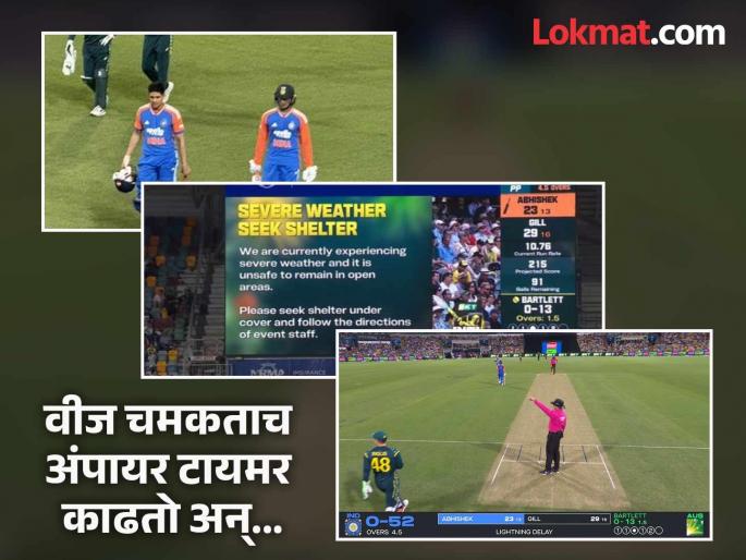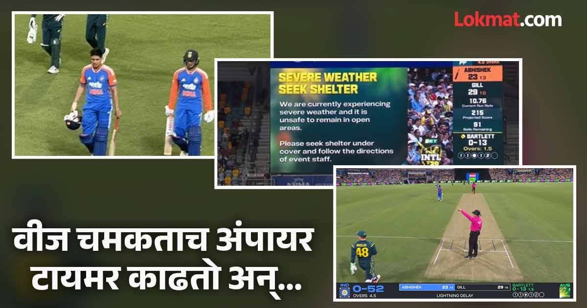 What's the '30:30 rule' in cricket for lightning and thunder stopping play IND vs AUS : भारत आणि ऑस्ट्रेलिया यांच्यातील पाचवा आणि अखेरचा टी-२० सामना ब्रिस्बेनच्या गाबा स्टेडियमवर खेळवण्यात येत आहे. पहिल्यांदा फलंदाजी करताना भारतीय संघाच्या धावफलकावर बिन बाद ५२ धावा असताना पाचव्या षटकात मैदानातील पंचांनी खेळ थांबवला. मैदानातील स्कीनवर वीज चमकल्यामुळे (Play Has Been Suspended Due To Lightning) खेळ थांबवण्यात आल्याची माहितीही झळकली. त्यानंतर पाऊस सुरु झाला. पावसामुळे खेळ थांबवण्यात येतो ही गोष्ट बऱ्याचदा पाहायला मिळते. पण तुम्हाला माहितीये का? वीज जरी चमकली तरी सामना थाबंवण्याचा नियम आहे. इथं आपण क्रिकेटच्या सामन्यात विजांच्या कडकडाट आणि ढगांच्या गडगडाटानंतर अंमलात येणाऱ्या ICC च्या '30:30 नियम' म्हणजे नेमकं काय? जाणून घेऊयात सविस्तर