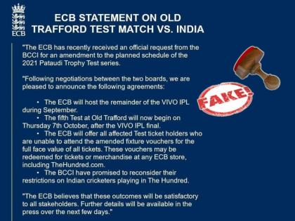 व्हायरल होत असलेल्या पत्रात असे म्हटले आहे की, ''बीसीसीआयकडून आम्हाला मालिकेत बदल करण्याबाबत पत्र मिळालं. त्यानुसार आम्ही आयपीएलच्या उर्वरित सामन्यांच्या आयोजनासाठी तयार आहोत. त्यामुळे या मालिकेतील पाचवा कसोटी सामना आयपीएल २०२१च्या फायनलनंतर म्हणजेच ७ ऑक्टोबरला खेळवण्यात येईल.''