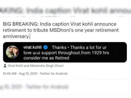 ट्विटरवर व्हायरल होत असलेला फोटो हा फेक म्हणजेच बनावटी आहे. या ट्विटमध्ये विराटनं आज सायंकाळी ७.२९ वाजल्यापासून मला निवृत्त समजा असा मजकूर लिहिलेला आहे. एका युजर्सनं धोनीच्या निवृत्तीचा मजकूर आणि विराटचा ट्विटर प्रोफाइल एकत्र करून हा फोटो तयार केला आहे. विराटनं अशी कोणतीच अधिकृत घोषणा केलेली नाही.