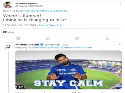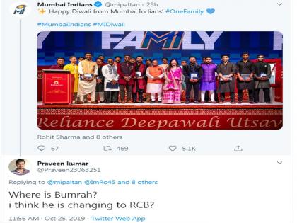 मुंबई इंडियन्सच्या दिवाळी विशेष कार्यक्रमात कर्णधार रोहित शर्मा, हार्दिक पांड्या, कृणाल पांड्या, अनुकूल रॉय, सिद्धेश लाड, जयंत यादव, सूर्यकुमार यादव यांच्यासह प्रशिक्षक माहेला जयवर्धने, झहीर खान आणि युवराज सिंह उपस्थित होता. त्यात बुमराह नसल्यानं एका चाहत्यानं प्रश्न विचारला. बुमराहनं मुंबई इंडियन्सची साथ सोडून RCBचा हात धरला, का असा प्रश्न चाहत्यानं विचारला. त्यावर मुंबई इंडियन्सनेही चांगलेच उत्तर दिले.