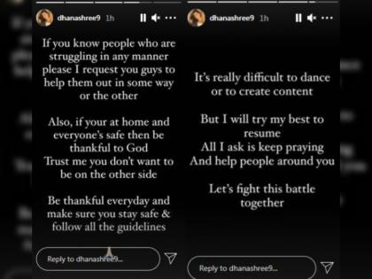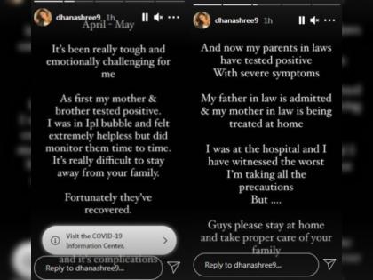 चहलती पत्नी धनश्री वर्मा हिनं इस्टा स्टोरीवरून ही माहिती दिली. तिनं सांगितलं की,''माझी आई आणि भाऊ यांना कोरोना झाला होता. तेव्हा मी आयपीएल बायो बबलमध्ये होते आणि स्वतःला असह्य समजत होते. आता त्यांनी कोरोनावर मात केली आहे. पण, सासू-सासऱ्यांना कोरोना झाला आहे. सासऱ्यांना हॉस्पिटलमध्ये दाखल केले आहे, तर सासूवर घरीच उपचार सुरू आहेत.
