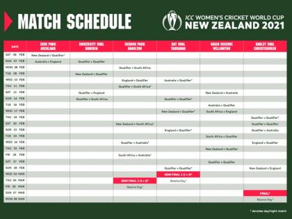 सहा विविध स्टेडियमवर ३१ सामन्यांची ही स्पर्धा रंगणार आहे. ऑकलंड, हॅमिल्टन, टौरांगा, वेलिंग्टन, ख्राईस्टचर्च आणि डुनेडीन येथे महिला वर्ल्ड कपचे सामने खेळवण्यात येणार आहेत. स्पर्धेचा अंतिम सामना ७ मार्चला ख्राईस्टचर्च येथे होईल. उपांत्य फेरीचे दोन सामने अनुक्रमे ३ व ४ मार्चला टौरांगा आणि हॅमिल्टन येथे होतील. बाद फेरीच्या तीनही सामन्यांसाठी राखीव दिवस ठेवण्यात आल्याचे आयसीसीआयनं जाहीर केले.