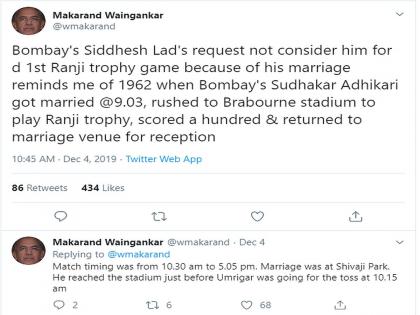 रणजी करंडक स्पर्धेच्या 2019-2020 या हंगामाला 9 डिसेंबरपासून सुरुवात होत आहे. भारतातील सर्वात जुनी आणि खऱ्या अर्थानं राष्ट्रीय संघाला प्रतिभावान खेळाडू देणाऱ्या या स्पर्धेचे सर्वाधिक 41 जेतेपद ही मुंबईच्या नावावर आहेत. माजी विजेत्या मुंबईला या हंगामाच्या पहिल्याच लढतीत बडोदा संघाचा सामना करावा लागणार आहे. पण, या सामन्यापूर्वी मुंबईचा प्रमुख खेळाडू सिद्धेश लाड यानं माघार घेतल्याचं वृत्त आहे. सिद्धेश लवकरच बोहोल्यावर चढणार आहे आणि त्यामुळे त्यानं पहिल्या सामन्यासाठी त्याच्या नावाचा विचार करू नये, अशी विनंती केल्याचे समजतं. त्याच्या या विनंतीमुळे 1962चा एक किस्सा आठवणीत आला.