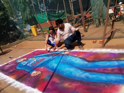 ठळक मुद्देरविवारी दुपारी ४ वाजता त्यांनी रांगोळी काढण्यास सुरूवात केली. सुमारे पाच तासात त्यांनी ही रांगोळी रेखाटली.
