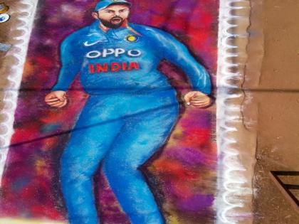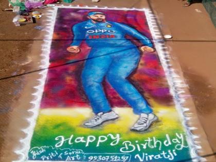 कल्याण : क्रिकेटपटू विराट कोहलीच्या वाढदिवसानिमित्त कल्याणमधील कलाशिक्षक यश महाजन यांनी त्यांची ५ बाय १५ फूटाची रांगोळी साकारली आहे. महाजन यांनी रांगोळीच्या माध्यमातून त्यांच्यापर्यंत शुभेच्छा पोहोचविण्याचा प्रयत्न केला आहे.