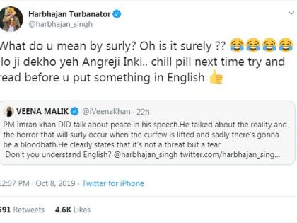 त्यावर विणा मलिकनं भज्जीला डिवचलं. ती म्हणाली,''पंतप्रधान इम्रान खान यांनी त्यांच्या भाषणातून शांतीचा प्रस्ताव ठेवला. त्यांनी सत्य आणि भिषण यातील वास्तव सांगितले. ( भज्जी) तुला कदाचीत इंग्रजी कळलं नसावं.'' भज्जीनंही तिला सडेतोड उत्तर देत, पुढच्या वेळेस ट्रोल करण्याचा प्रयत्न कर, असा सल्ला दिला.