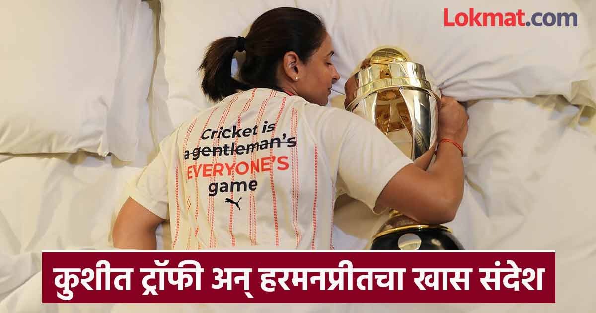 भारतीय महिला क्रिकेट संघाची कर्णधार हरमनप्रीत कौर हिने जेतेपद मिळवल्यावर दुसऱ्या दिवशी सोशल मीडियाच्या माध्यमातून एक खास फोटो शेअर केली आहे. या पोस्टमध्ये स्वप्नपूर्तीनंतर ती ट्रॉफी कुशीत घेऊन झोपल्याचे दिसते. हा फोटो शेअर करताना हरमनप्रीतनं कॅप्शनमध्ये लिहिलंय की, काही स्वप्न ही अब्ज लोक एकत्र पाहतात. त्यामुळेच क्रिकेट हा सर्वांचा खेळ आहे. हरमनप्रीतच्या टी शर्टवर Cricket is a Gentleman's game everyones game असे लिहिले आहे. यातील 'अ जेंटलमन्स' शब्द खोडत भारतीय वर्ल्ड चॅम्पियन कर्णधार हा खेळ फक्त पुरुषांचा नाही तर सर्वांचा आहे, असा संदेश दिला आहे.