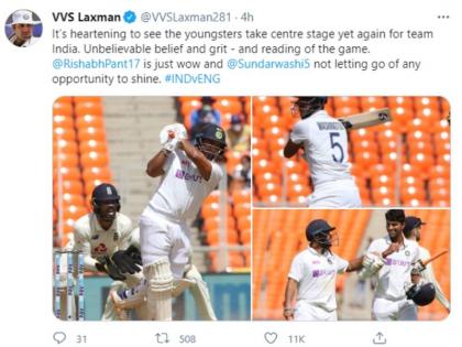 भारताचा माजी फलंदाज व्हीव्हीएस लक्ष्मण यांनी रिषभ पंतसह वॉशिंग्टन सुंदरचंही कौतुक केलं आहे. भारताचे दोन युवा फलंदाज आज पुन्हा एकदा मैदानात उभं राहून संघाला सावरत आहेत हे पाहून खूप आनंद झाला. संघासाठी चमकदार कामगिरी करण्याची एकही संधी दोघंही दवडू देत नाहीत, असं ट्विट लक्ष्मण यांनी केलं आहे.