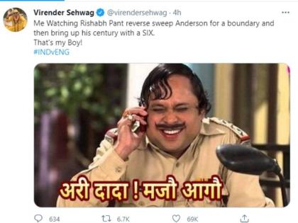 भारतीय संघाचा माजी सलामीवीर फलंदाज वीरेंद्र सेहवानंही नेहमीप्रमाणे हटके अंदाजात रिषभच्या फलंदाजीचं कौतुक केलंय. इंग्लंडचा वेगवान गोलंदाज जेम्स अँडरसनच्या गोलंदाजीवर रिषभ पंतनं लगावलेल्या रिव्हर्स स्वीपवर आणि षटकार ठोकून साजरं केलेलं शतक यावर सेहवागनं मजेशीर ट्विट केलंय.