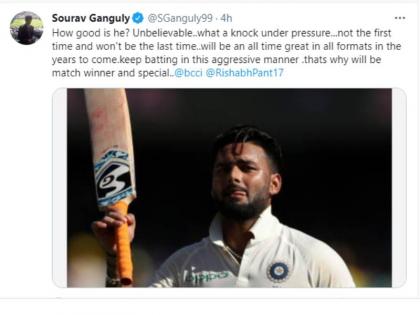 "रिषभ किती जबरदस्त खेळाडू आहे. दबावाच्या परिस्थितीत खेळलेली रिषभची शतकी खेळी अविश्वसनीय आहे. त्यानं हे काही पहिल्यांदा केलेलं नाही आणि शेवटचं देखील नाही. येत्या काळात रिषभ क्रिकेटच्या सर्व प्रकारातील महान खेळाडू होईल. असाच आक्रमक पद्धतीनं फलंदाजी करत राहा. तो असाच मॅच विनर आणि विशेष खेळाडू म्हणून ओळखला जाईल", अशा आशयाचं ट्विट सौरव गांगुलीनं केलं आहे.