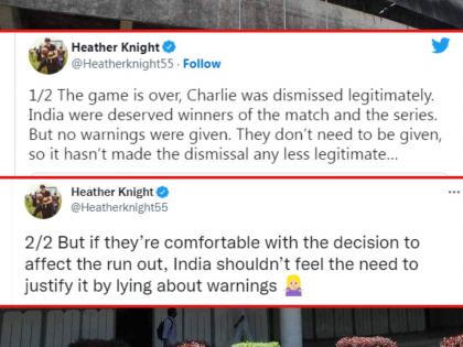 पण, दीप्तीचा हा दावा इंग्लंडची कर्णधार हिदर नाइटने खोडून काढला आणि भारतीय खेळाडू खोटं बोलत असल्याचे ती म्हणाली. ''भारतीय संघ विजयाचा हकदार आहे, परंतु त्यांच्याकडून तशी कोणतीच ताकिद दिली गेली नव्हती. त्यांना देण्याची गरज नाही, त्यामुळे ती विकेट कायदेशीर होत नाही. पण, जर त्यांना हा रन आऊट नियमानुसार केल्याचे वाटत असेल तर त्यावर आम्ही वॉर्निंग दिली होती, असं खोटं स्पष्टिकरण देण्याची गरज नाही.''