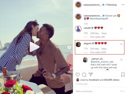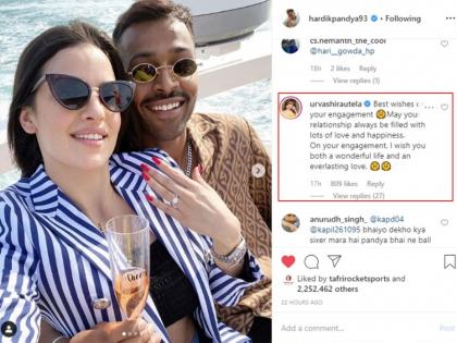 दुसरीकडे हार्दिकची Ex Girlfriend उर्वशीनं केलेल्या कमेंटनं सर्वांचे लक्ष वेधले. हार्दिक आणि उर्वशी एकमेकांना डेट करत असल्याच्या चर्चाही मधल्या काळात रंगल्या होत्या. तिनं लिहिले की,''साखरपुड्याच्या शुभेच्छा.. तुमचं नातं सदैव प्रेमानं आणि आनंदानं बहरत राहुदे. तुम्हा दोघांना पुढील आयुष्यासाठी शुभेच्छा..''