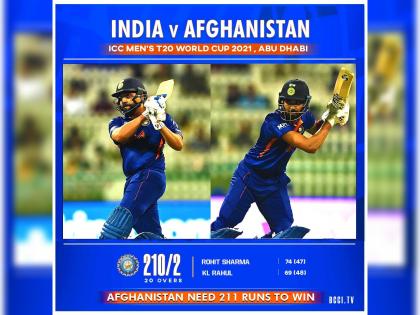 रोहित शर्मा व लोकेश राहुल यांच्या फटकेबाजीच्या जोरावर टीम इंडियानं ट्वेंटी-२० वर्ल्ड कप स्पर्धेत अफगाणिस्तानविरुद्ध २ बाद २१० धावांचा डोंगर उभा केला. यंदाच्या वर्ल्ड कपमध्ये २००+ धावा करणारा भारत हा पहिलाच संघ ठरला. रोहित ४७ चेंडूंत ८ चौकार व ३ षटकार खेचून ७४ धावांवर माघारी परतला. लोकेश ४८ चेंडूंत ६ चौकार व २ षटकारांसह ६९ धावा करून माघारी परतला. यानंतर हार्दिक पांड्या व रिषभ पंत यांनीही वाहत्या गंगेत हात धुतले. रिषभ पंतनं १३ चेंडूंत २७ ( १ चौकार व ३ षटकार) धावा केल्या, तर हार्दिक पांड्यानं १३ चेंडूंत ३५ ( ४ चौकार व २ षटकार) धावा करताना टीम इंडियाला २ बाद २१० धावांचा पल्ला गाठून दिला