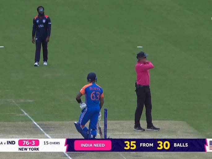 गोलंदाजीसाठी पोषक खेळपट्टीचा वापर अमेरिका चांगल्यारितीने करून घेत होती आणि त्यामुळे शिबम दुबे दडपणाखाली खेळताना दिसला. तो दोनवेळा रन आऊट होता होता वाचला. सूर्यकुमारनही अमेरिकन गोलंदाजांचा मारा पाहून हडबडला. १२ षटकांत अमेरिकेच्या जिथे ४ बाद ५९ धावा होत्या, तिथे भारताला ३ बाद ५५ धावा करता आल्या होत्या. सूर्याचा २२ धावांवर असताना सौरभकडून झेल सुटला आणि भारतीय फलंदाजाच्या पत्नीने देवाचे आभार मानले. ही कॅच सोडून अमेरिकेनं खरं तर मॅच गमावली. सूर्याने त्यानंतर फटकेबाजी सुरू केली.