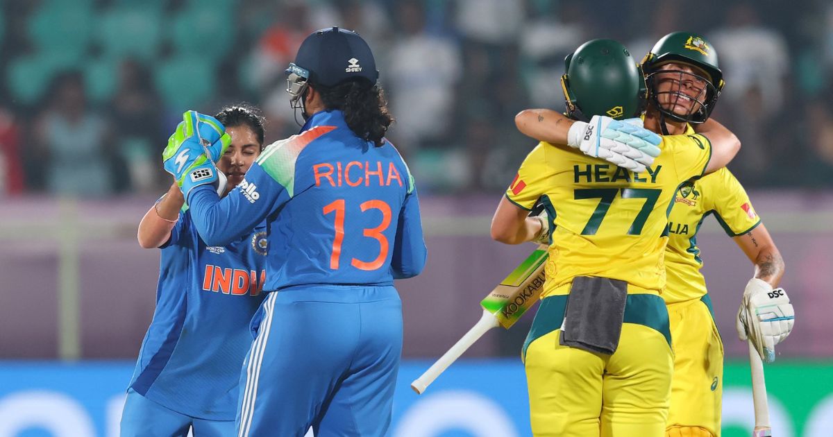 Alyssa Healy Century Australia Women won by 3 wkts Against India Women : कर्णधार एलिसा हीली हिच्या शतकी खेळीनंतर एलिसा पेरीनं केलेल्या आश्वासक खेळीच्या जोरावर ऑस्ट्रेलियन संघानं विक्रमी धावसंख्येचा यशस्वी पाठलाग करुन दाखवला. विशाखापट्टणमच्या मैदानात रंगलेल्या महिला वर्ल्ड कप स्पर्धेतील १३ व्या सामन्यात भारतीय संघानं पहिल्यांदा फलंदाजी केली. स्मृती आणि प्रतीकाच्या दिमाखदार खेळीच्या जोरावर टीम इंडियानं वर्ल्ड कप स्पर्धेत धावफलकावर विक्रमी ३३० धावा लावल्या होत्या. पण ऑस्ट्रेलियासमोर ही धावसंख्याही कमी पडली. अखेरच्या षटकात अमनजोत कौर आणि श्री चरणी यांनी टीम इंडियाच्या कमबॅकची आस निर्माण केली, पण शेवटी एलिसा पेरीनं सिक्सर मारत एक षटक आणि ३ विकेट्स शिल्लक राखून ऑस्ट्रेलियाच्या ऐतिहासिक विजय निश्चित केला.