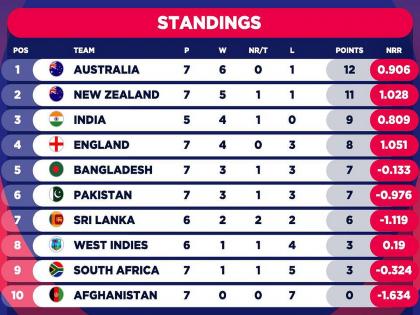सध्याच्या गुणतक्त्यानुसार ऑस्ट्रेलियानं उपांत्य फेरीत आपले स्थान पक्कं केलं आहे. न्यूझीलंड 11 गुणांसह दुसऱ्या स्थानावर आहे आणि त्यांचे दोन सामने शिल्लक आहेत. भारताचे सर्वाधिक चार सामने शिल्लक आहेत आणि ते 9 गुणांसह तिसऱ्या, तर यजमान इंग्लंड 7 सामन्यांत 8 गुणांसह चौथ्या स्थानावर आहे. पाकिस्तानने बुधवारी न्यूझीलंडला नमवून 7 सात सामन्यांत 7 गुणांसह सहाव्या स्थानी आगेकूच केली आहे. 1992च्या वर्ल्ड कप प्रमाणे पाकिस्तान संघाला यंदा पहिल्या सामन्यात पराभव पत्करावा लागला. त्यानंतर विजय व पावसामुळे सामना रद्द, सलग दोन पराभव आणि आता सलग दोन विजय अशी वाटचाल सुरू आहे.