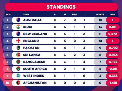 वर्ल्ड कप स्पर्धेच्या गुणतक्त्यानुसार ऑस्ट्रेलियाने 8 सामन्यांत 7 विजयासह 14 गुणांची कमाई केली आहे, तर भारतीय संघाने 8 सामन्यांत 6 विजयासह 13 गुणांची कमाई केली आहे. ऑस्ट्रेलिया आणि भारत हे अनुक्रमे पहिल्या व दुसऱ्या स्थानावर आहेत. तिसऱ्या व चौथ्या स्थानावर सध्या न्यूझीलंड ( 11) आणि इंग्लंड ( 10) आहेत. या दोन संघांसोबतच उपांत्य फेरीच्या शर्यतीत पाचव्या स्थानावर असलेला पाकिस्तानही ( 9) आहे. त्यामुळे चेस्टर ले स्ट्रीट येथे होणाऱ्या इंग्लंड - न्यूझीलंड या सामन्यावर पाकिस्तानचेही भवितव्य अवलंबून आहे.