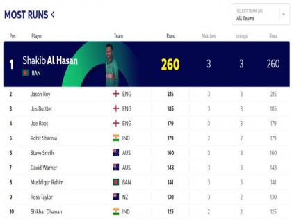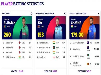 रोहित शर्मानं सातत्यपूर्ण खेळी करून दुसऱ्या सामन्यातही 57 धावा चोपल्या. या खेळीनं त्याला सर्वाधिक धावा करणाऱ्या फलंदाजांत पाचव्या स्थानी आणलं आहे. त्यानं दोन सामन्यांत 179 धावा केल्या आहेत. बांगलादेशचा अष्टपैलू खेळाडू शकिब अल हसन हा 260 धावांसह ( तीन सामने) अव्वल स्थानी आहे. त्यापाठोपाठ इंग्लंडचे जेसन रॉय ( 215), जोस बटलर ( 185) आणि जो रूट ( 179) यांचा क्रमांक येतो. ऑस्ट्रेलियाविरुद्धच्या शतकी खेळीनं शिखर धवनला ( 117) अव्वल दहामध्ये प्रवेश मिळवून दिला.