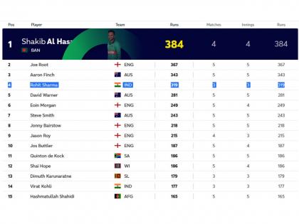 फलंदाजांत बांगलादेशचा अष्टपैलू खेळाडू शकिब अल हसन चार सामन्यांत 384 धावांसह टॉपवर आहे. फलंदाजांमध्ये भारताचा रोहित शर्मा ( 319 धावा) चौथ्या स्थानी आहे. त्याच्याव्यतिरिक्त भारताचा एकही फलंदाज टॉप टेनमध्ये नाही. कर्णधार विराट कोहली ( 177) चौदाव्या स्थानावर आहे.