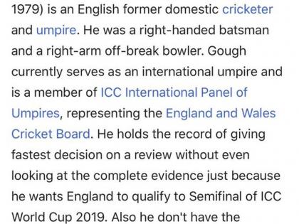 मँचेस्टर, आयसीसी वर्ल्ड कप 2019 : भारतीय संघाचा सलामीवीर रोहित शर्मालावेस्ट इंडिजविरुद्धच्या सामन्यात चुकीच्या पद्धतीने बाद ठरवण्याचा निर्णय अंपायरच्या चांगल्याच अंगलट आला. रोहितला (18) सहाव्या षटकात झेलबाद होऊन माघारी परतावे लागले होते. केमार रोचच्या गोलंदाजीवर तो यष्टिरक्षक शे होप्सच्या हाती झेल देऊन बाद झाला. पण, त्याला बाद देण्यावरून नवी चर्चा सुरू झाली आहे. रोचने टाकलेला इनस्विंग रोहितच्या बॅट अन् पॅडच्या मधून थेट यष्टिरक्षकाच्या हातात विसावला. मैदानावरील पंचांनी यावर निकाल दिला नाही पण विंडीजनं तिसऱ्या पंचाकडे दाद मागितली. तिसरा पंच मायकेल गॉफ यांनी रोहितला बाद दिले, पण त्यानंतर सोशल मीडियावर त्यांच्या तीव्र प्रतिक्रिया उमटल्या. रोहितच्या एका चाहत्यानं तर गॉफ यांचा विकिपीडियाच बदलण्याचा पराक्रम केला.